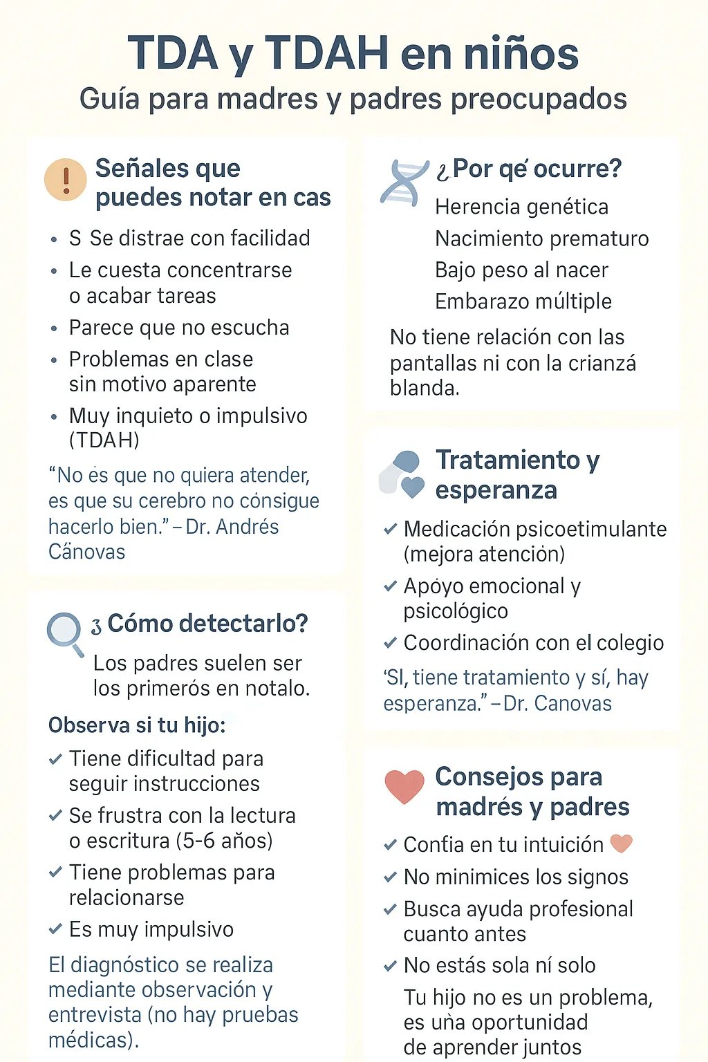 Muchos padres confunden la hiperactividad con una conducta normal de la infancia. Sin embargo, el TDAH va más allá: afecta la capacidad de concentración, la impulsividad y la gestión emocional. Si esas conductas interfieren en su vida escolar, social o familiar, es momento de consultar a un especialista.